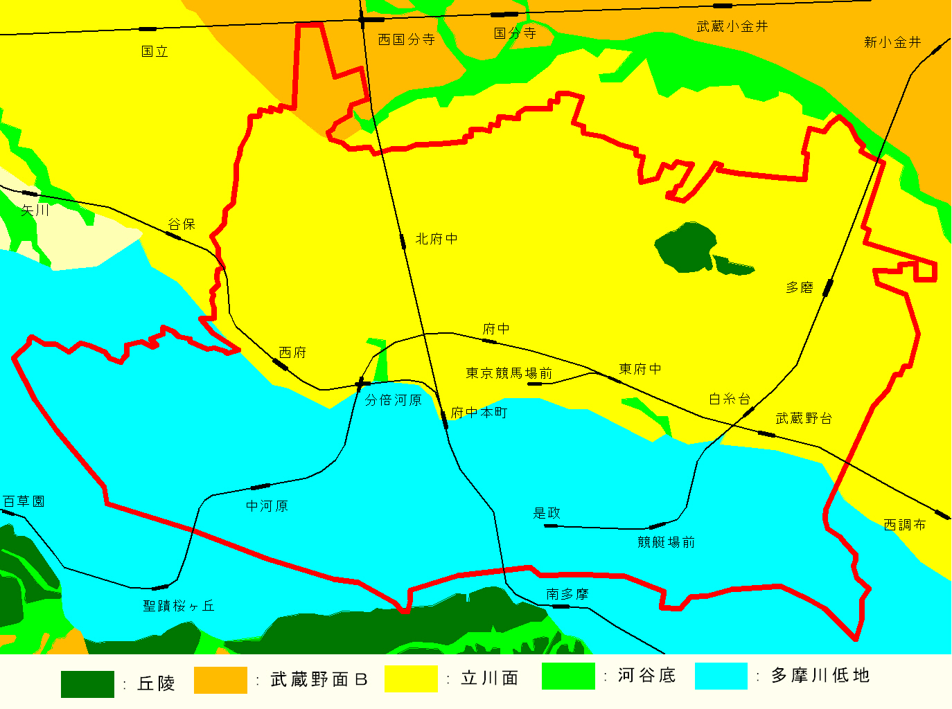 府中市の地盤種別 府中市の地盤種別は、北側の台地が立川面が主体で、北西端部に武蔵野面Bが分布します。また、多磨の西側には立川面中に丘陵が分布します。南部の多摩川沿いに多摩川低地からなります。この他、台地部の河川・谷間には河谷底が分布します。