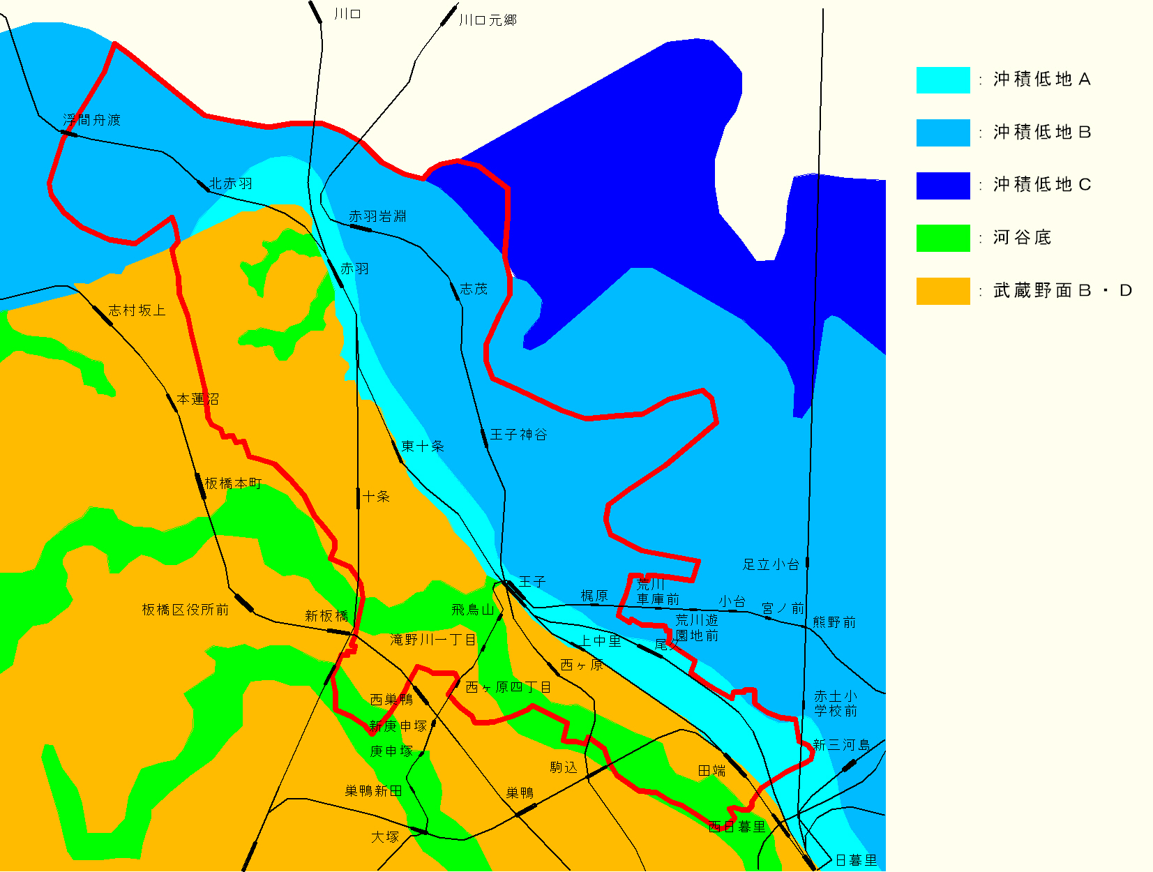 北区の地盤種別は、北東側の低地部が沖積低地Bを主体に、台地沿いに沖積低地A、北東端部に沖積低地Cが分布します。南西側の台地部は武蔵野面からなり、河川・谷間に河谷底が分布します。