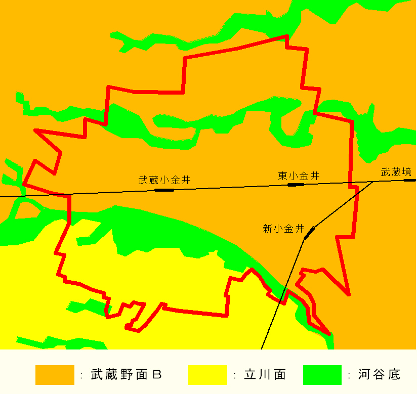 小金井市の地盤種別は、北側が武蔵野面Bからなり、南側に立川面が分布します。また、台地の河川・谷間沿いに河谷底が分布します。