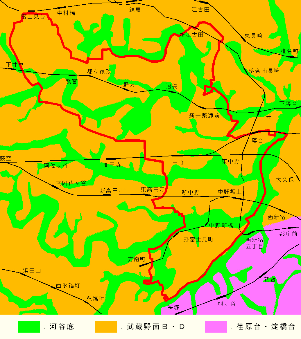 中野区の地盤種別は、主に武蔵野面からなり、河川・谷間に河谷底が分布します。