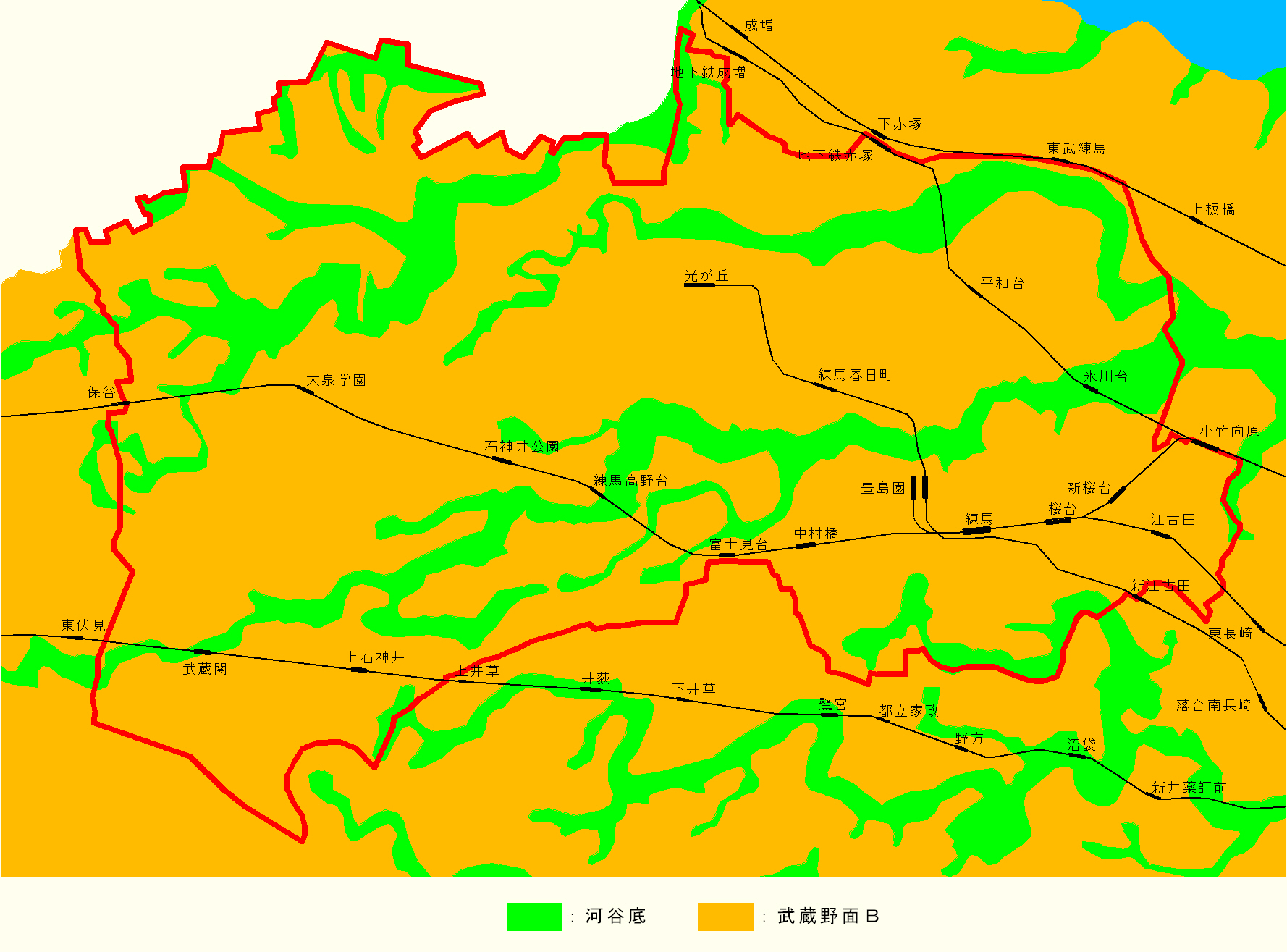 練馬区の地盤種別は、台地部の武蔵野面と、河川・谷間に河谷底からなります。
